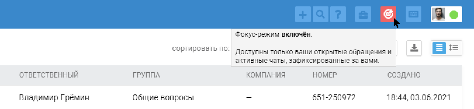 К примеру, если указать в этой настройке «1», то когда у сотрудника не останется открытых обращений, фокус-режим временно отключится, и сотрудник снова получит доступ ко всем обращениям, пока не выставит себя ответственным в каком-то из них.