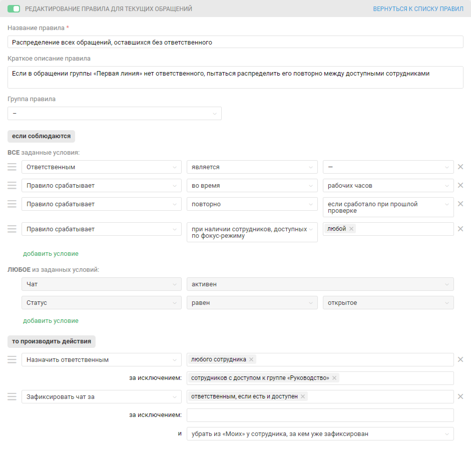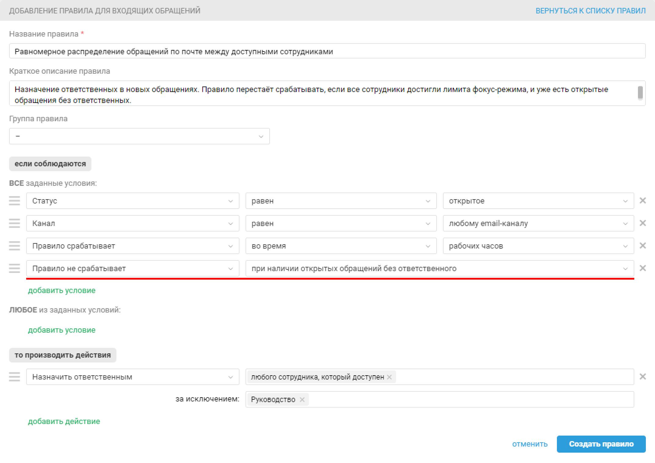 Перед добавлением этого условия в правила убедитесь, что у вас нет каких-то старых или тестовых обращений в статусе «открытое», в которых нет ответственного, потому что иначе новые обращения перестанут распределяться.