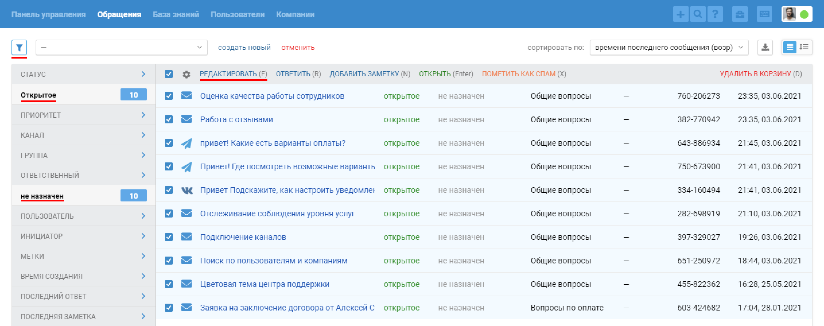 б) У сотрудника выставляется фильтр «Открытые», в котором он видит только свои открытые обращения, а чужие обращения и обращения без ответственного от него скрываются, чтобы сотрудник не отвлекался на них и не мог самостоятельно выбирать лёгкие обращения.