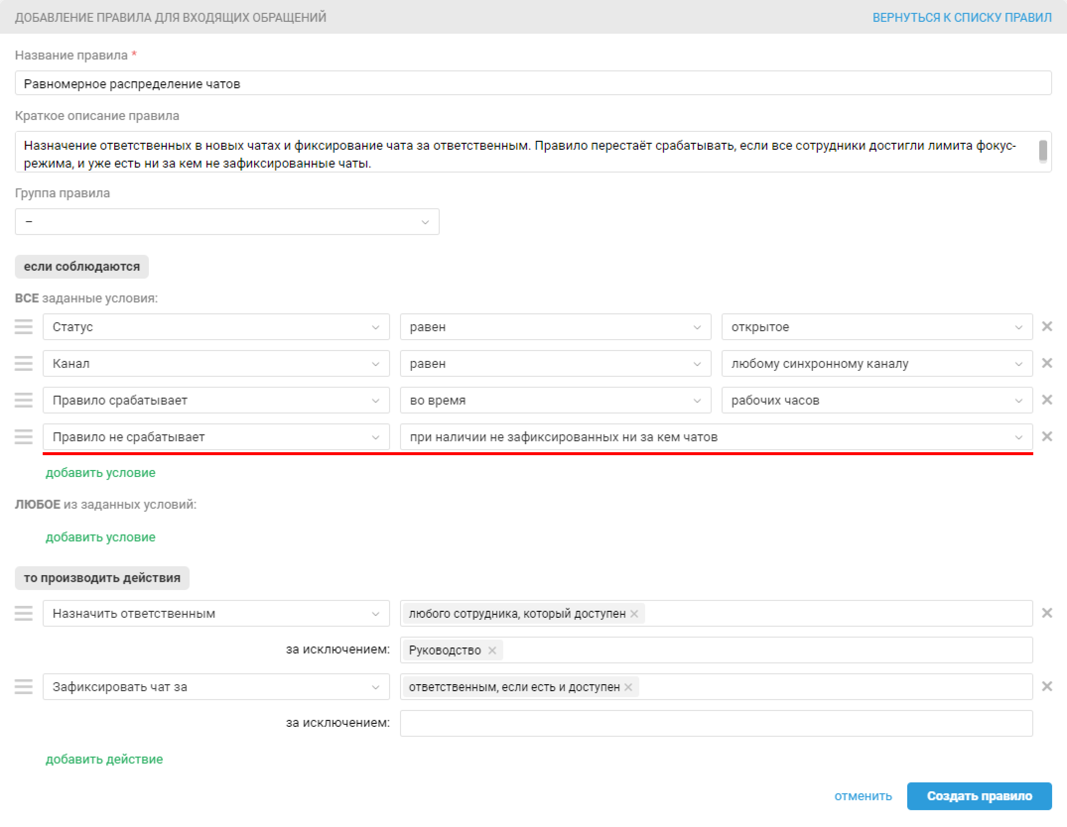 б) В правилах для распределения чатов (обращения по сообщениям из соцсетей, мессенджеров, кастомных синхронных каналов) в блоке «Все заданные условия» нужно добавить условие «Правило не срабатывает — при наличии не зафиксированных ни за кем чатов».