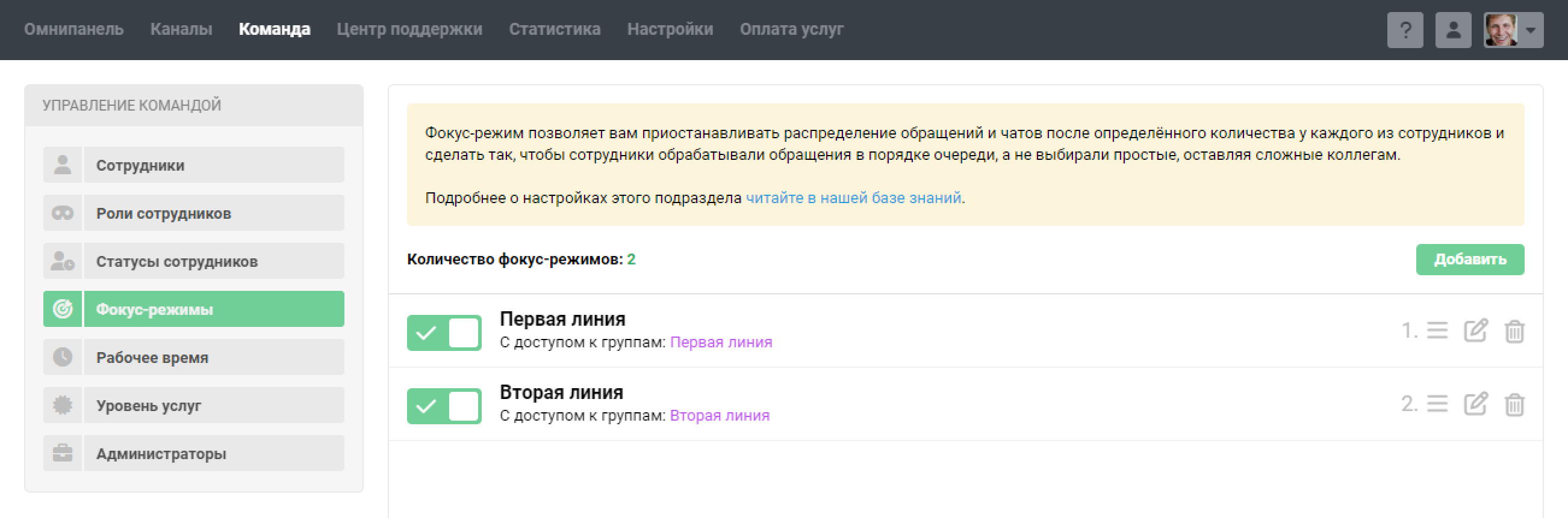 Если же сотрудник всегда работает добросовестно и вы уверены, что он сам хорошо понимает, каким клиентом стоит сейчас заняться, временно отключать фокус-режим можно раньше — когда у сотрудника ещё есть парочка открытых обращений.