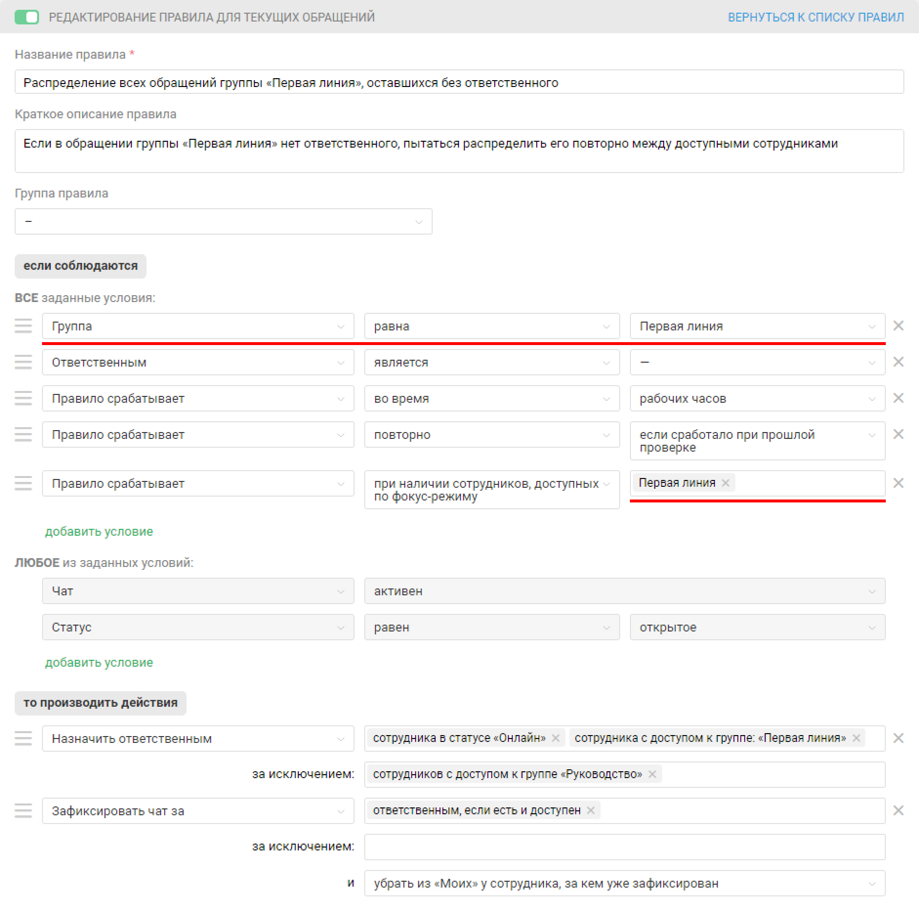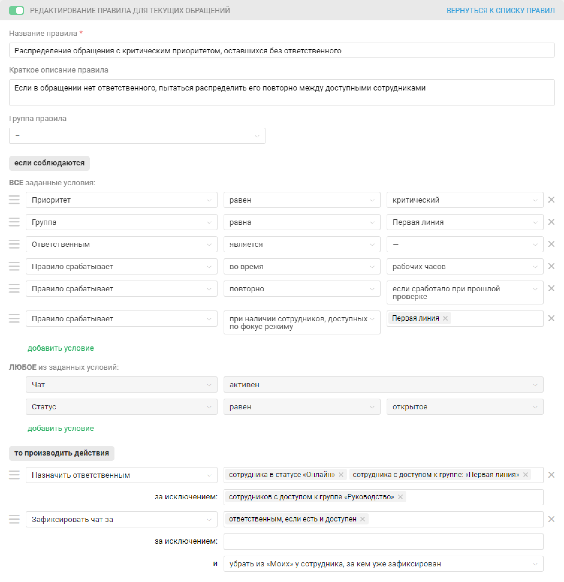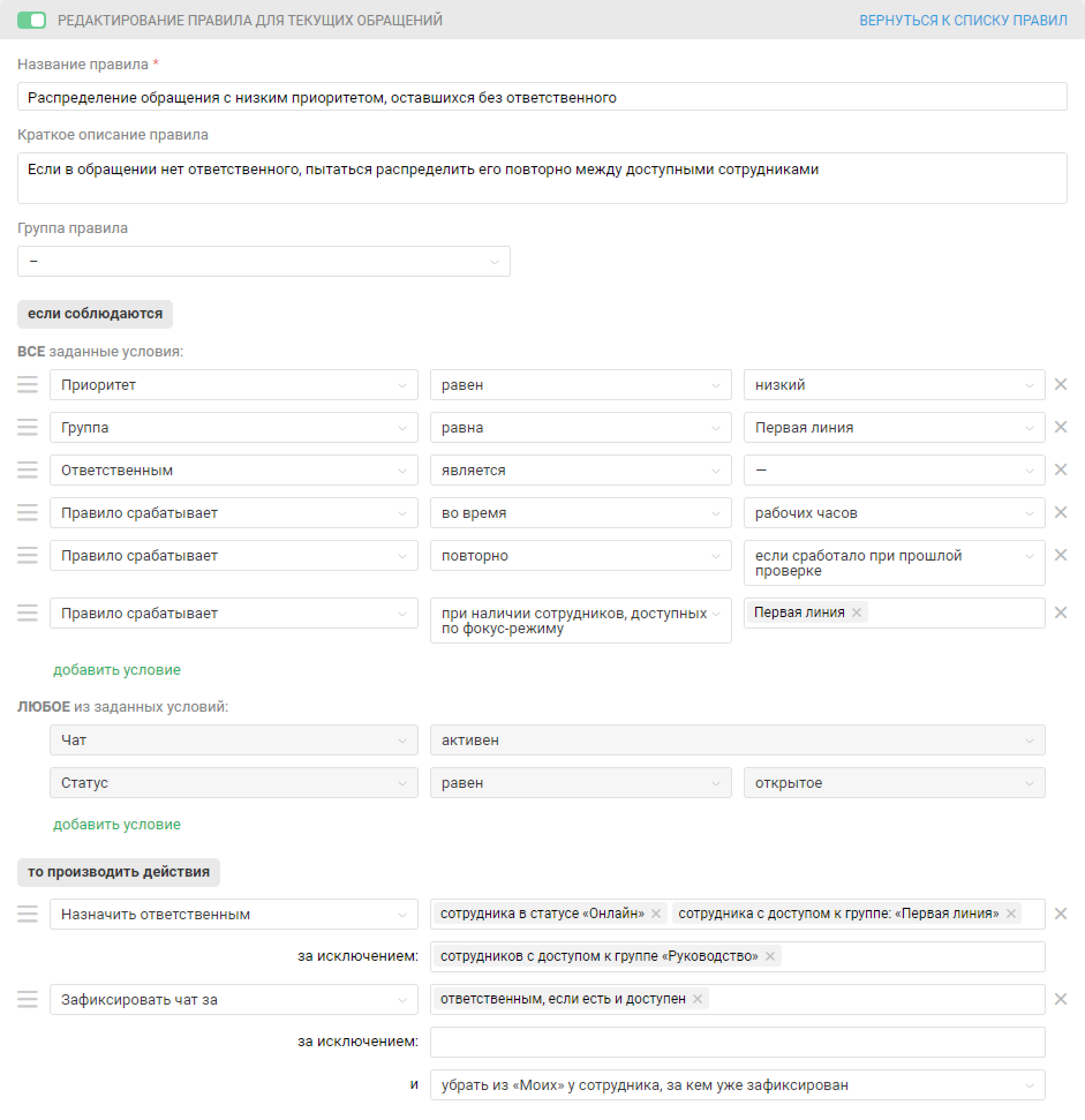 Если сотрудники быстро отвечают на обращения и в настройке «Сотрудник участвует в распределении, пока у него не будет» задано всего 2-3 обращения/чата, имеет смысл добавить это условие в правила для перераспределения обращений, чтобы сотрудникам не приходилось ждать новых обращений.