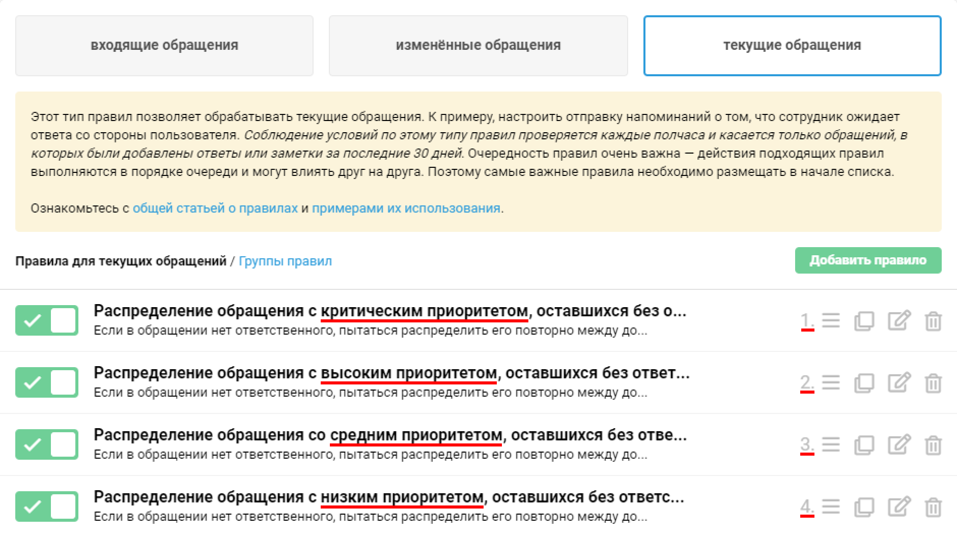 б) Если вы используете приоритеты при работе с обращениями и сотрудники в первую очередь должны отвечать на обращения с повышенным приоритетом, а не на те, в которых пользователи давно ждут ответа, эту задачу можно решить через разные правила распределения для обращений с разным приоритетом. Их нужно обязательно расположить в определённом порядке, чтобы в списке правило, распределяющее обращения с высоким приоритетом, было расположено выше правила, распределяющего обращения с низким приоритетом.