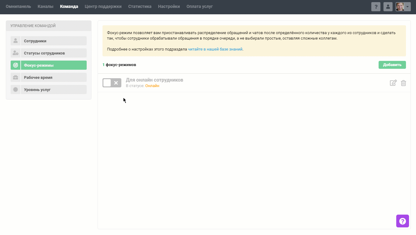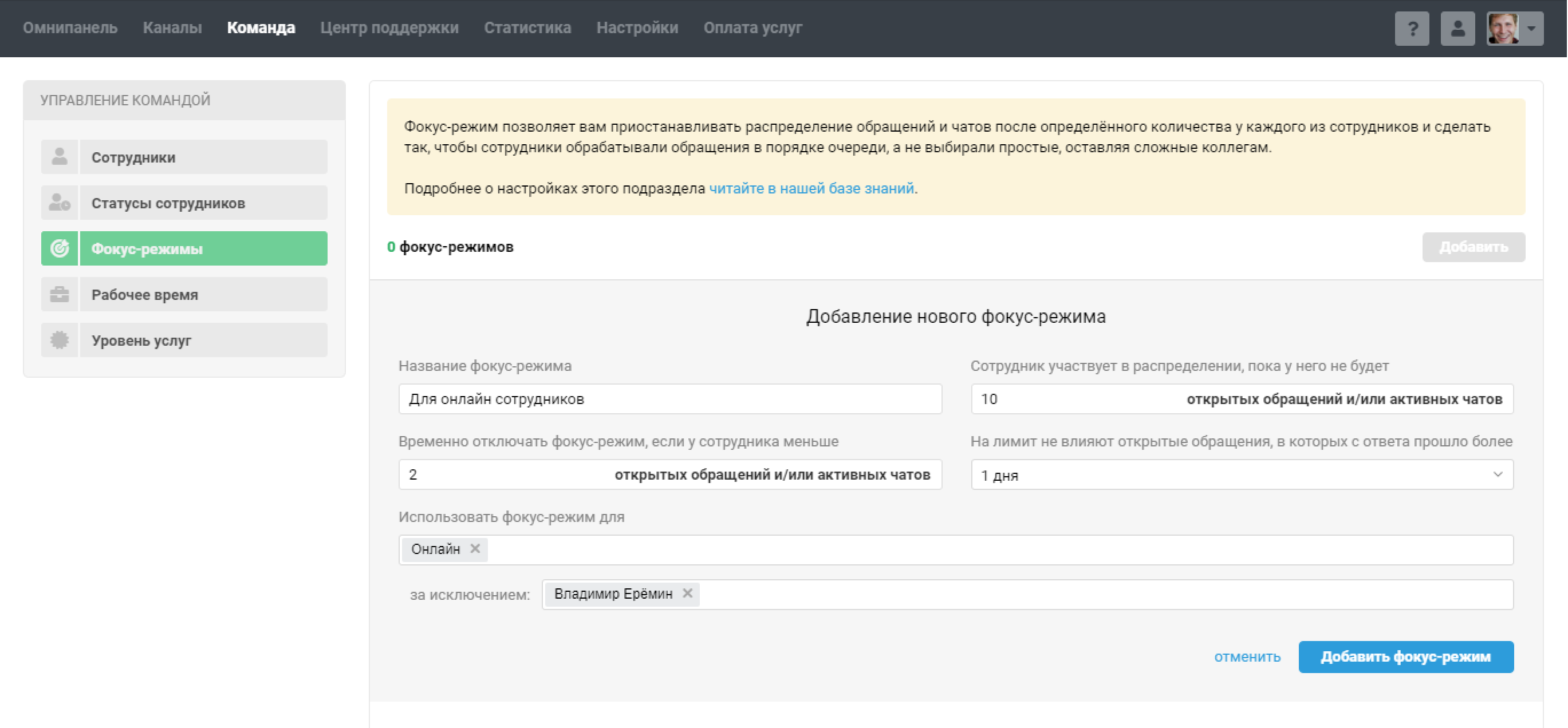 3. Временно отключать фокус-режим, если у сотрудника меньше Х открытых обращений и/или активных чатов