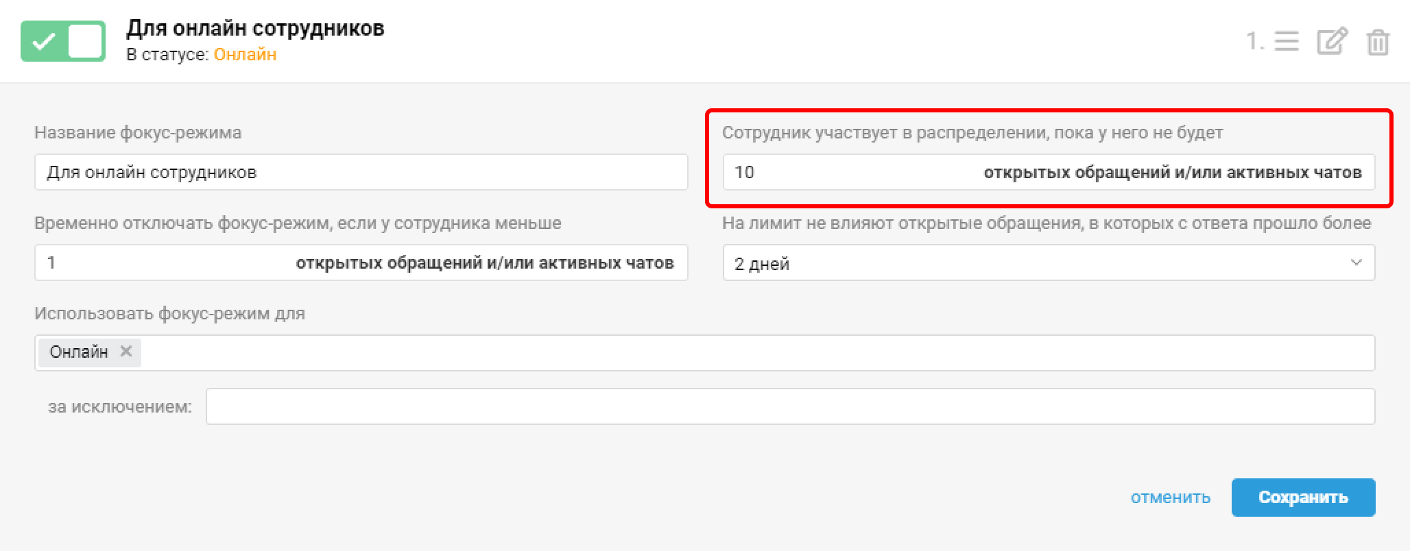г) При распределении обращений через правила автоматизации будет учитываться, какое максимальное количество открытых обращений и/или активных чатов может быть назначено на сотрудника в соответствии с включенным для него фокус-режимом.