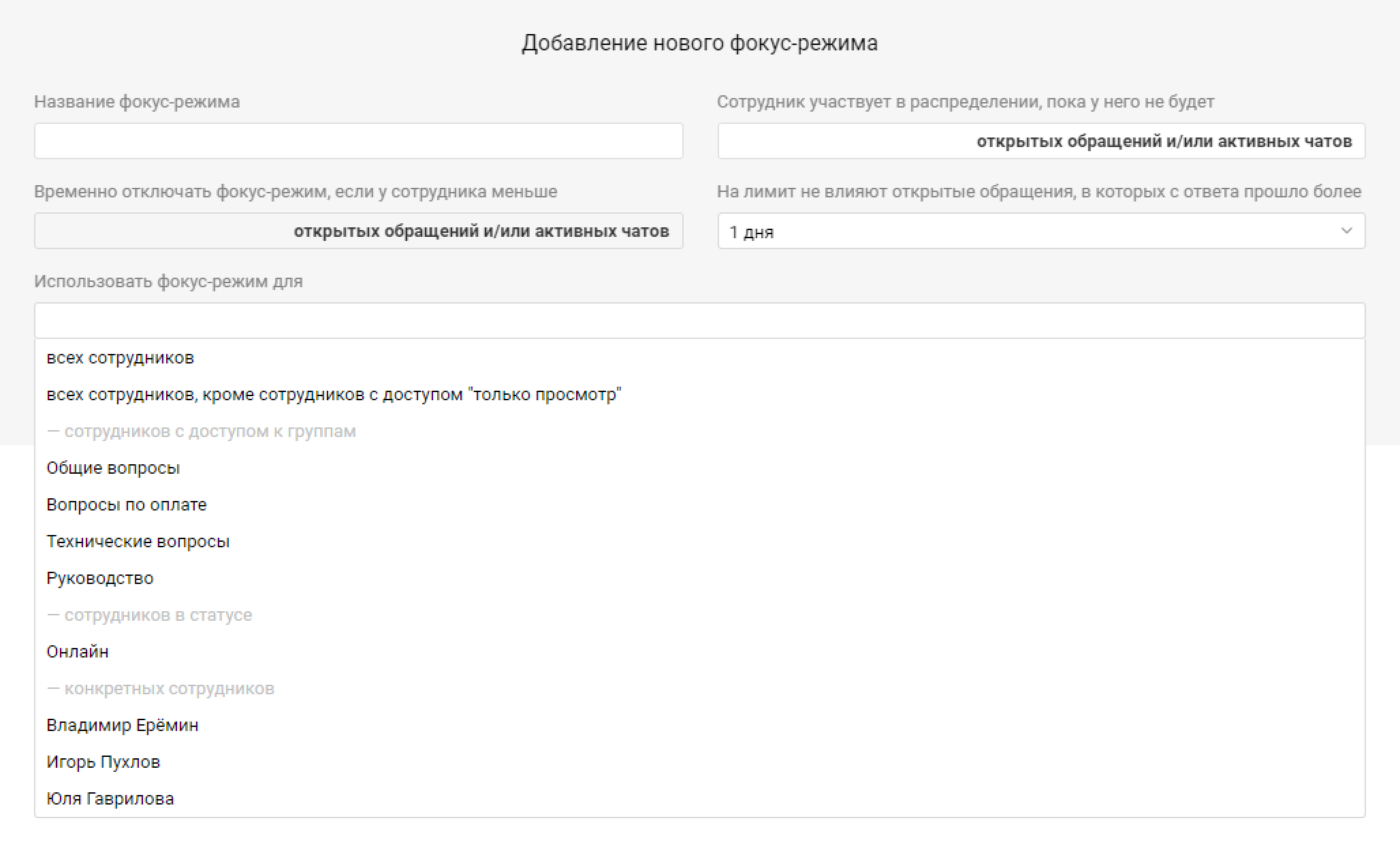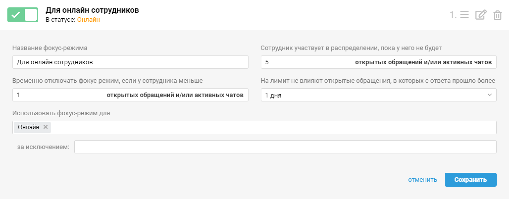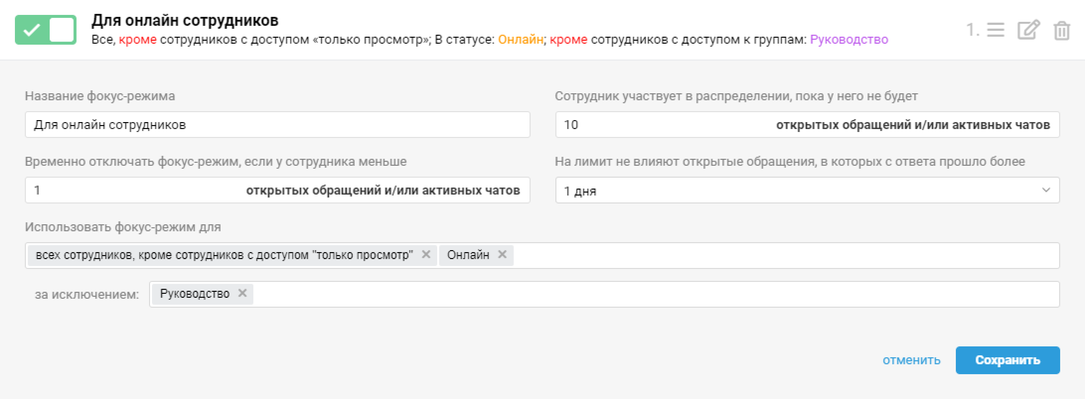 Теперь рассмотрим подробнее доступные настройки в фокус-режимах, а также примеры правил для распределения и перераспределения обращений.
